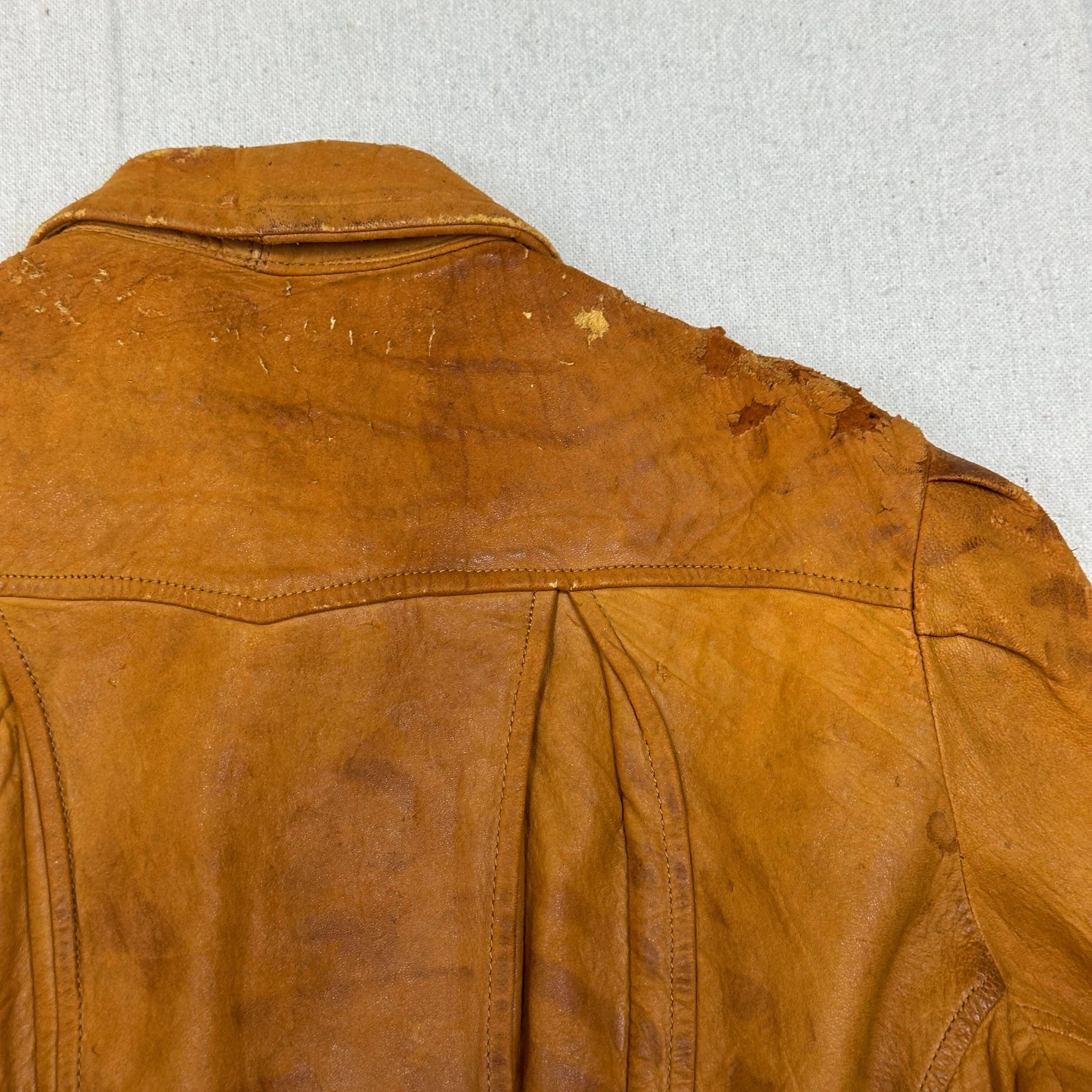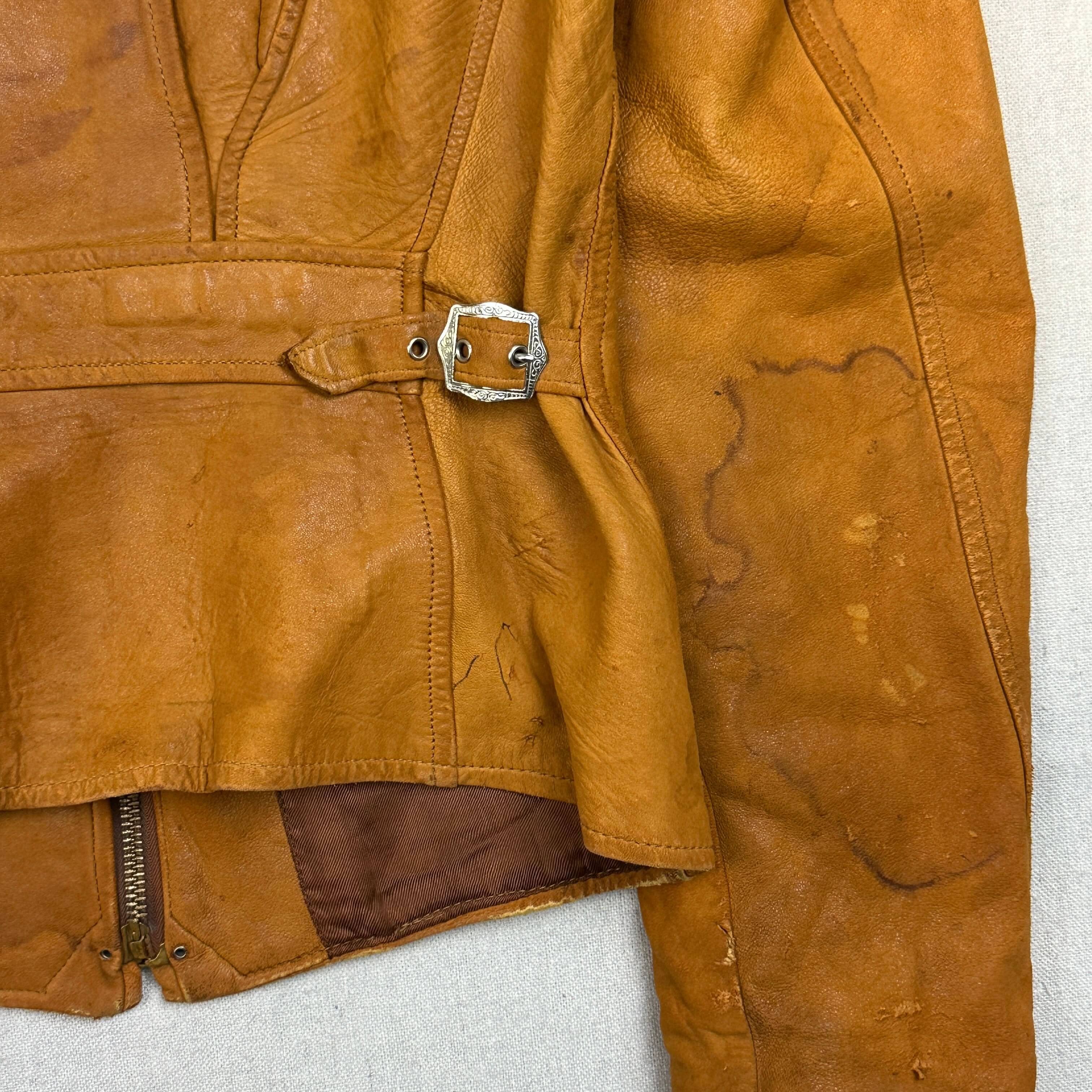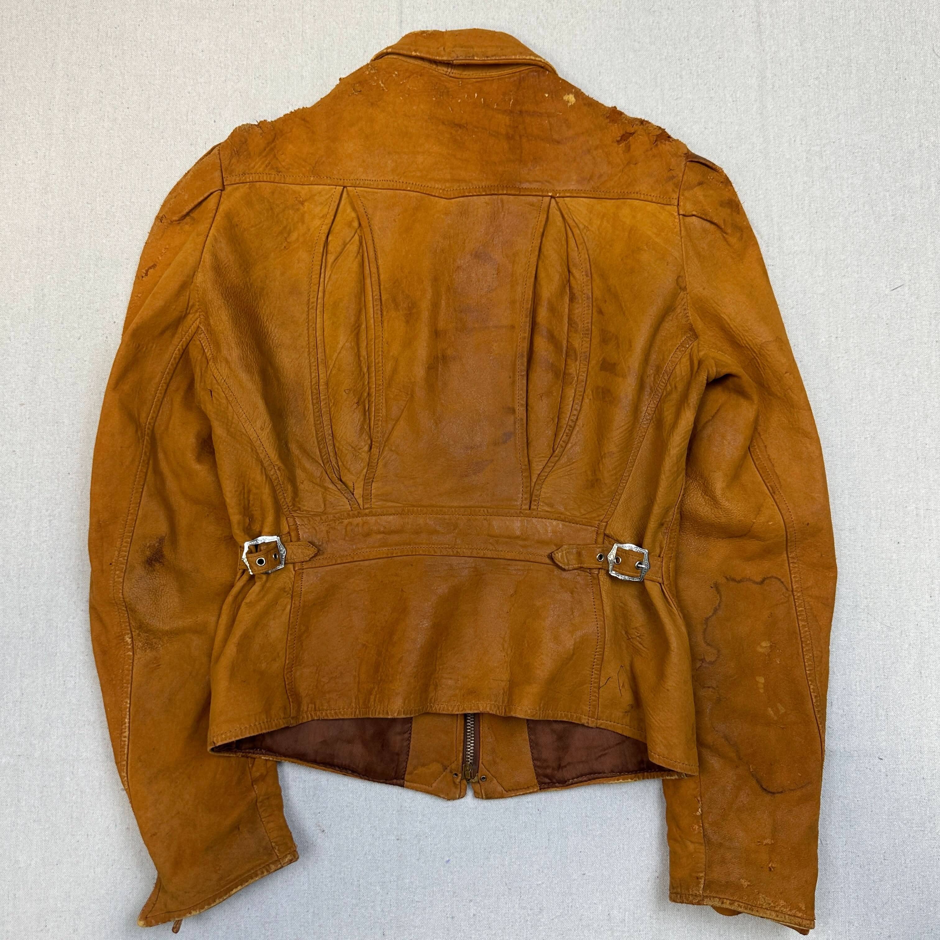 This jacket features a classic suede finish with evident signs of wear, including marks, creasing, and visible scuffs throughout. The edges and seams show distress, especially along the collar and shoulders. Buckle waist adjusters and the structured silhouette enhance its vintage charm. Please review all photos for condition.