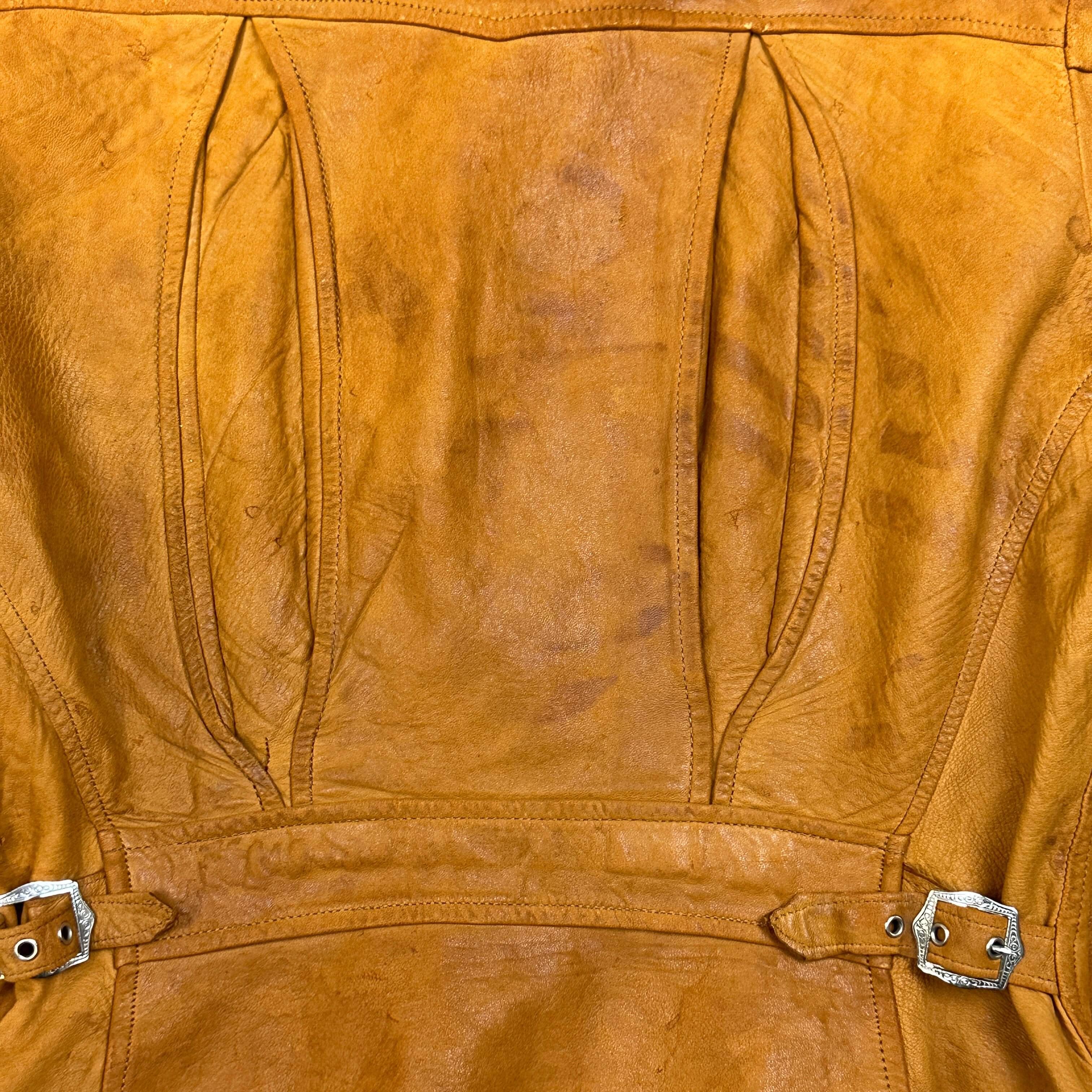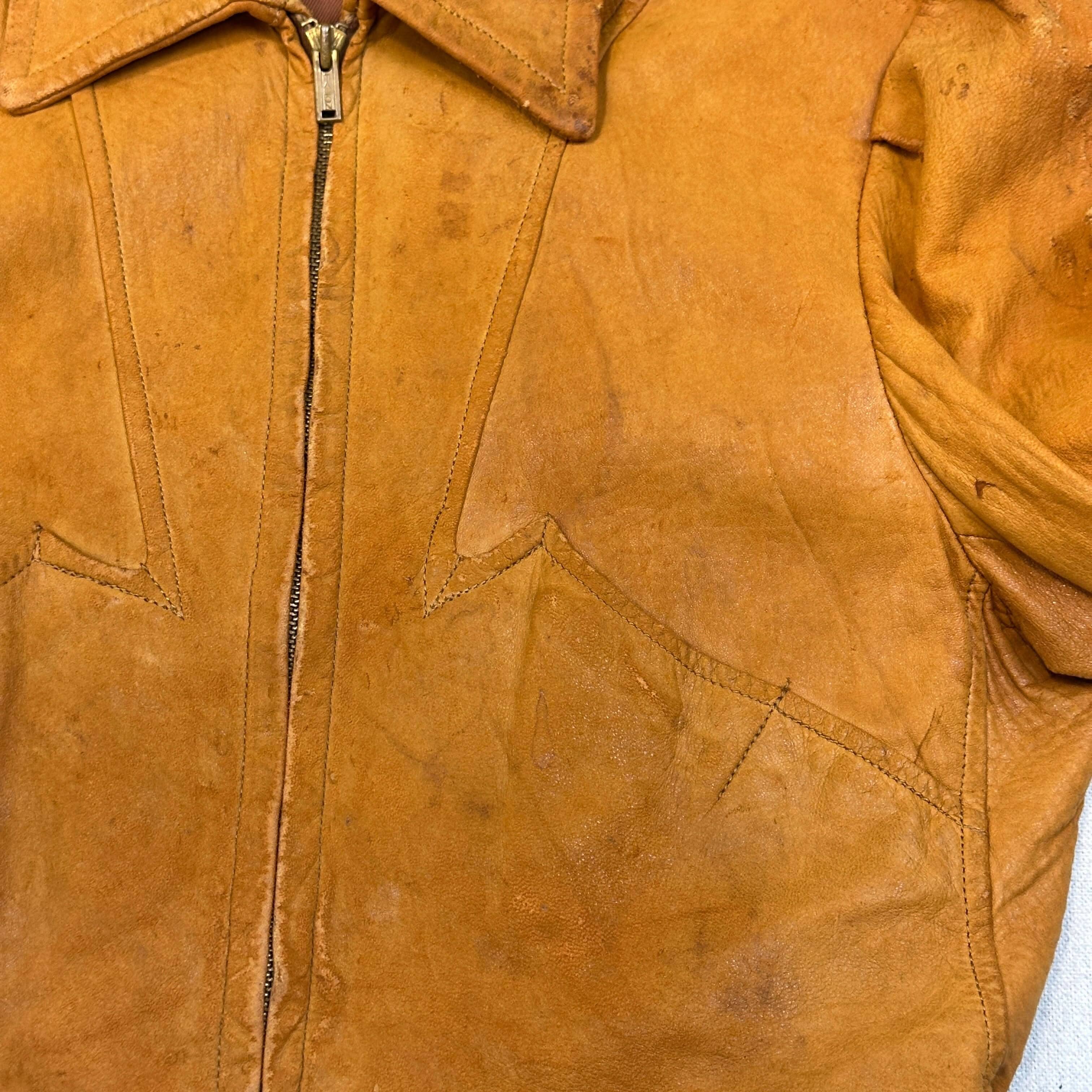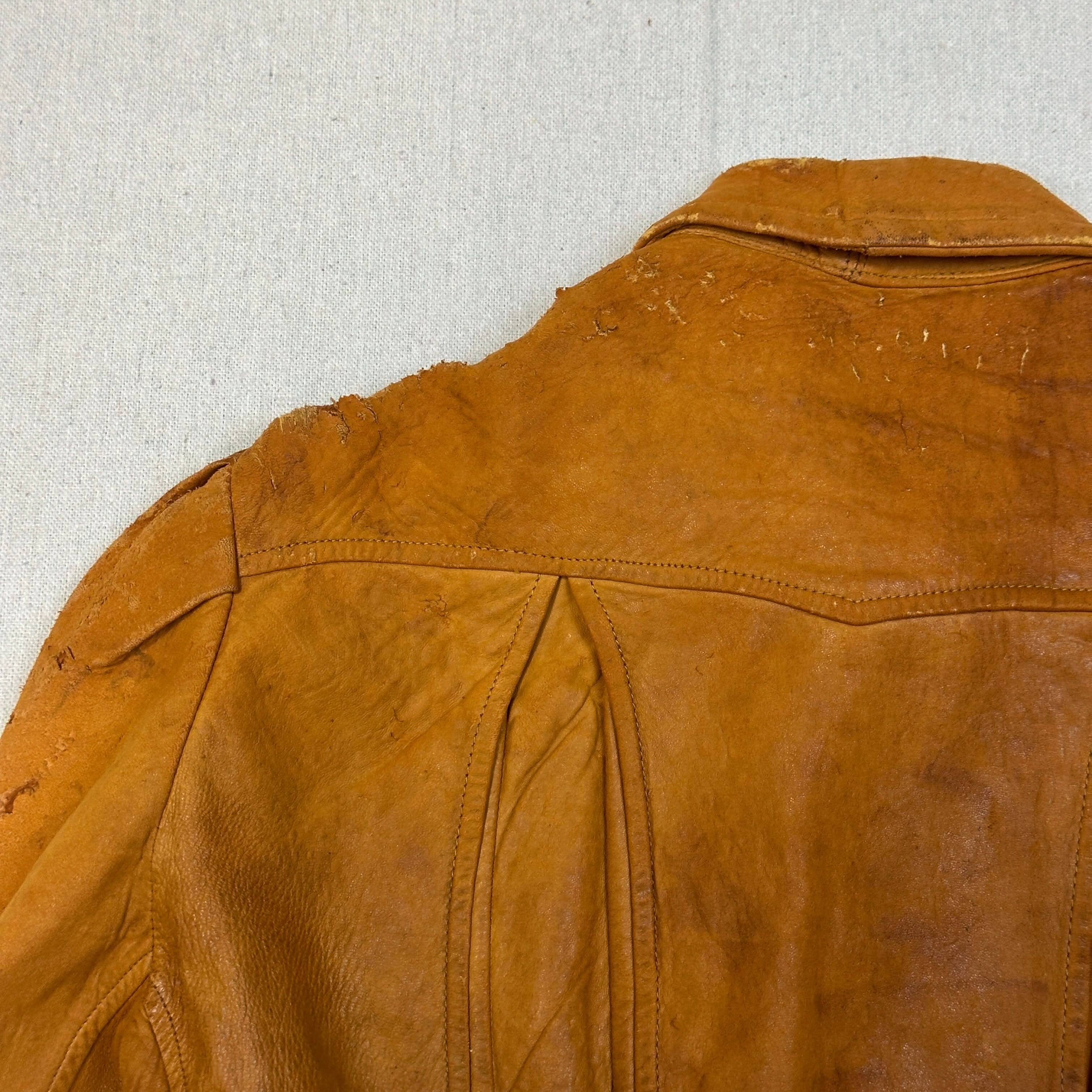 This jacket features a classic suede finish with evident signs of wear, including marks, creasing, and visible scuffs throughout. The edges and seams show distress, especially along the collar and shoulders. Buckle waist adjusters and the structured silhouette enhance its vintage charm. Please review all photos for condition.