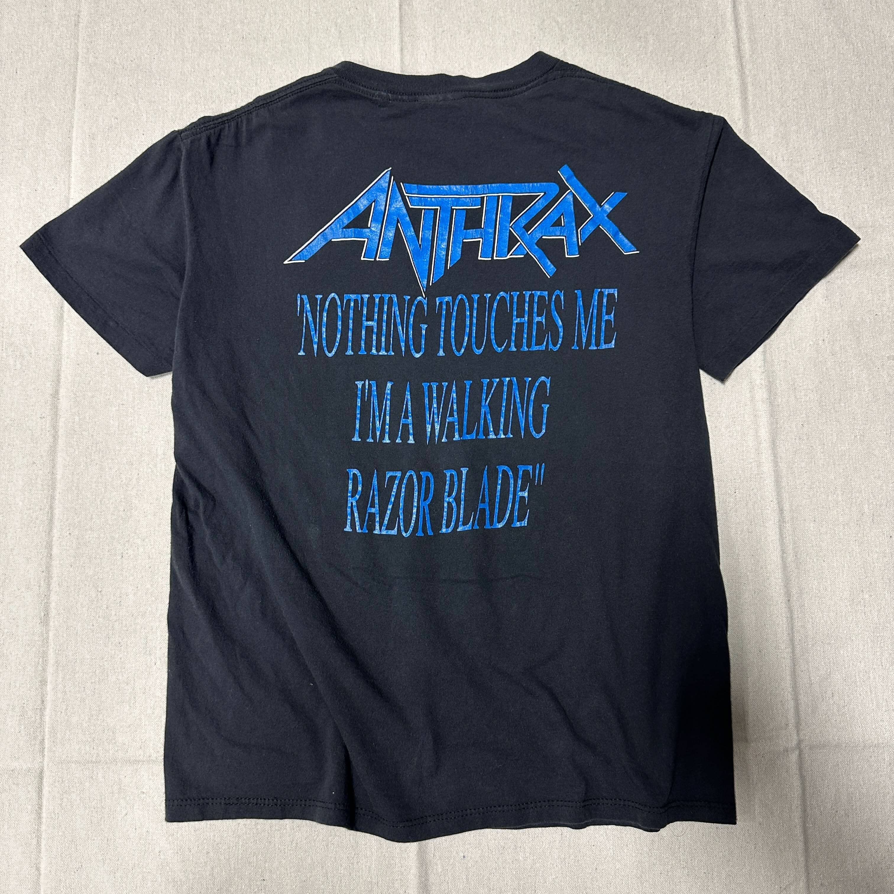 Overall gently worn condition with minor fading typical of age. Large Anthrax "In My World" front print, vibrant back hit, soft vintage fabric.