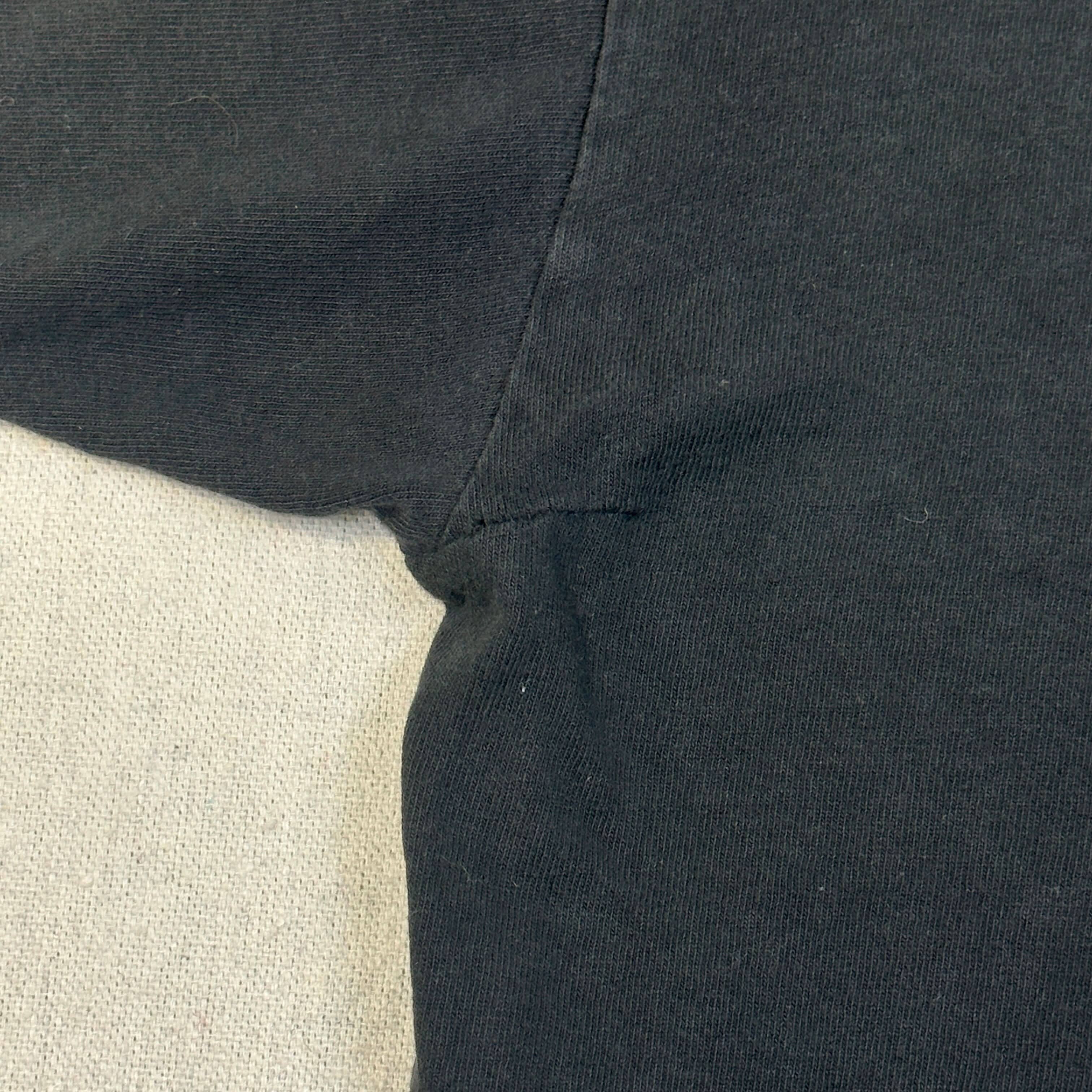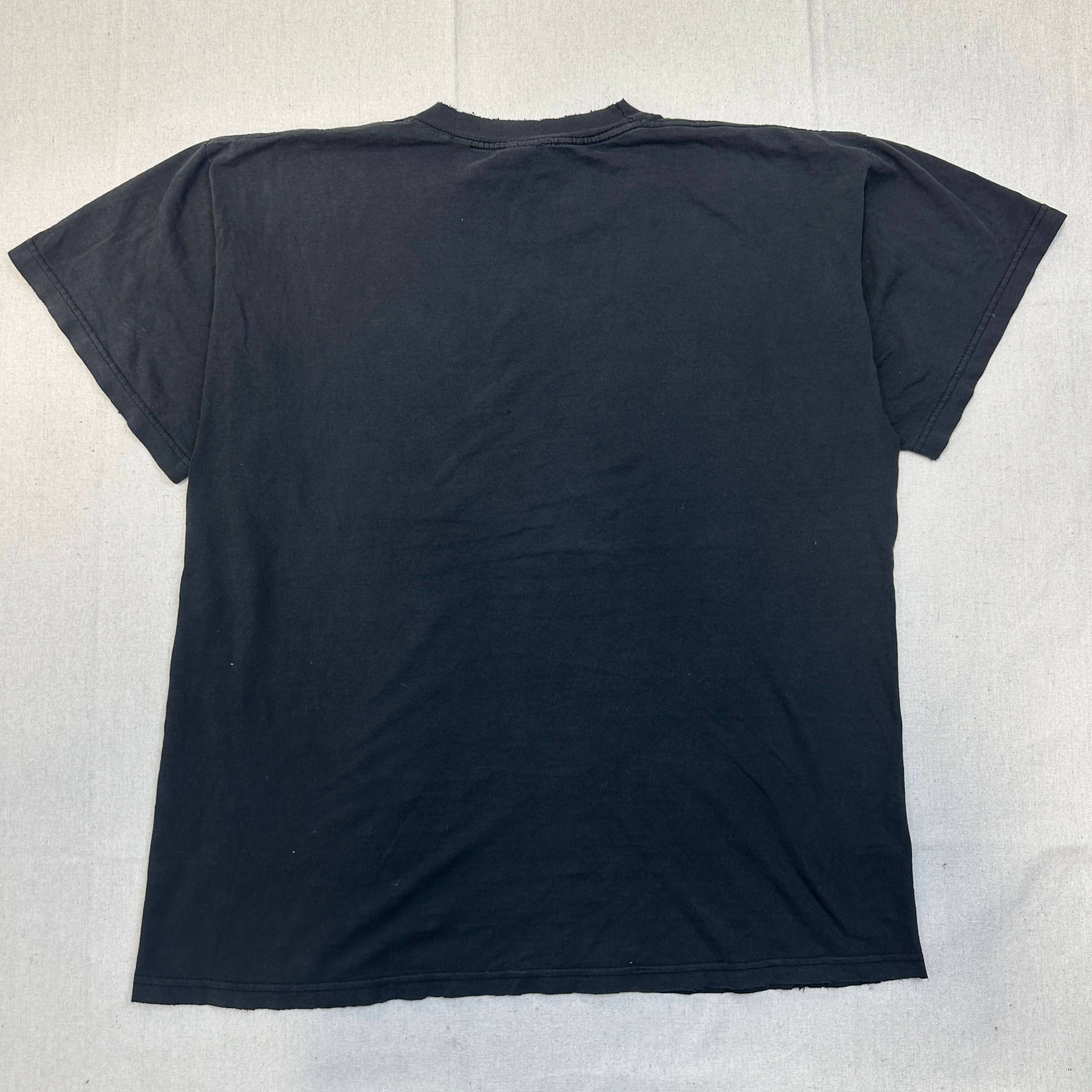 This shirt shows visible wear consistent with age, including fading on the print, areas of minor discoloration, a small hole near the hem, and fabric wear at the underarm. Please review photos for condition details.